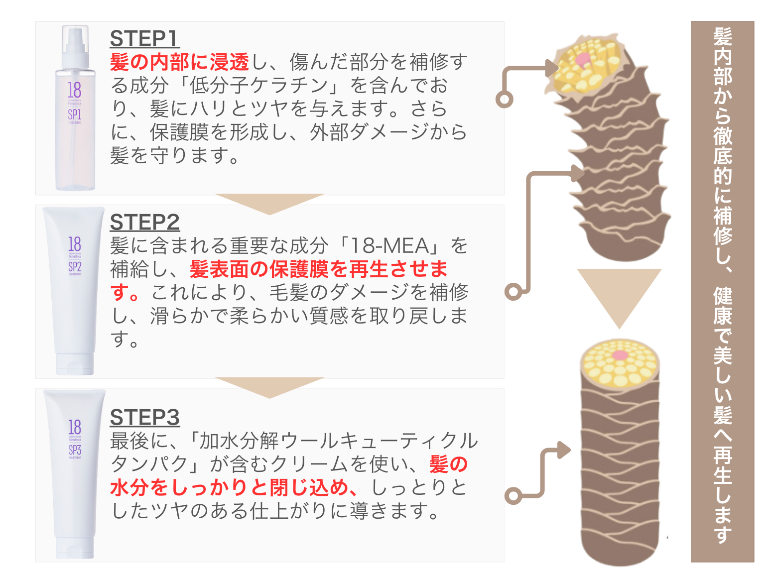 髪の内部にタンパク質を供給し、繰り返し施術を受けることで、髪の芯から変化を実感できるようになります。